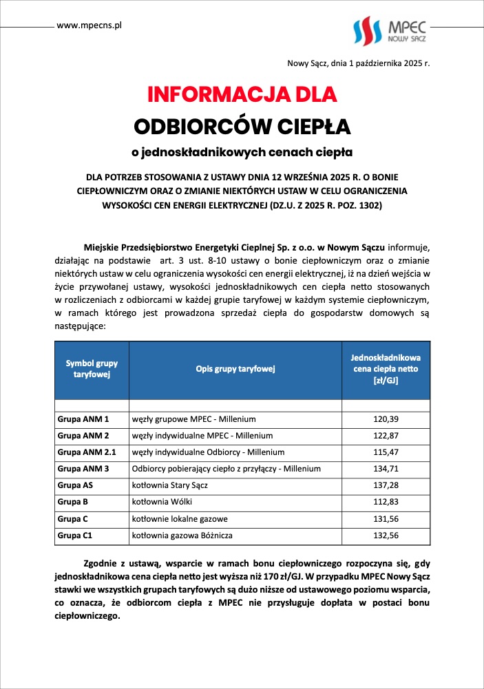 W związku z wejściem w życie, w dniu 30 września 2025 roku, ustawy o bonie ciepłowniczym oraz o zmianie niektórych ustaw w celu ograniczenia cen energii elektrycznej, MPEC Nowy Sącz informuje o jednoskładnikowych cenach ciepła netto, które są stosowane w rozliczeniach z odbiorcami w każdej grupie taryfowej (ANM 1, ANM 2, ANM 2.1, ANM 3, AS, B, C, C1).