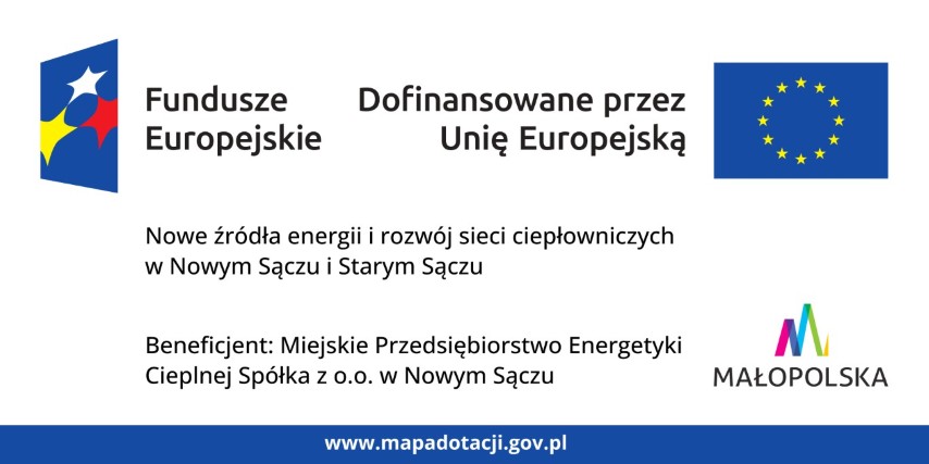 - Dofinansowanie na realizację projektu Miejskie Przedsiębiorstwo Energetyki Cieplnej Sp. z o.o. w Nowym Sączu otrzymał z Urzędu Marszałkowskiego Województwa Małopolskiego w ramach Europejskiego Funduszu Rozwoju Regionalnego, program Fundusze Europejskie dla Małopolski 2021-2027, priorytet Fundusze europejskie dla środowiska, działanie 2.4 Rozwój sieci ciepłowniczych.